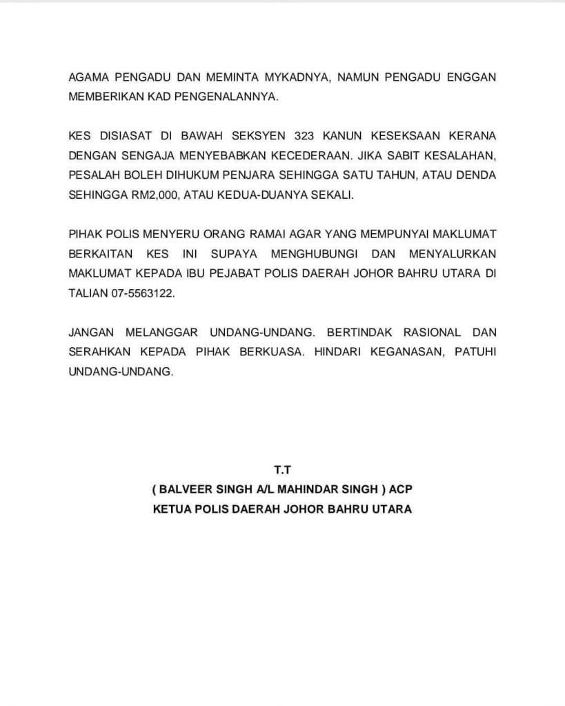 Menurut Ketua Polis Daerah Johor Bahru Utara, ACP Balveer Singh Mahindar Singh, laporan polis dibuat oleh mangsa, seorang lelaki berusia 21 tahun, yang mendakwa diserang oleh individu tidak dikenali ketika sedang menikmati makanan.