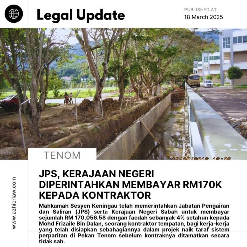 Keningau, 18 Mac 2025 – Mahkamah Sesyen Keningau telah mengarahkan Jabatan Pengairan dan Saliran (JPS) serta Kerajaan Negeri Sabah untuk membayar RM170,056.58 kepada seorang kontraktor tempatan, Mohd Frizaile Bin Dalan. Keputusan ini dibuat selepas mahkamah mendapati bahawa kontrak projek yang diberikan kepada kontraktor tersebut telah ditamatkan secara tidak sah.