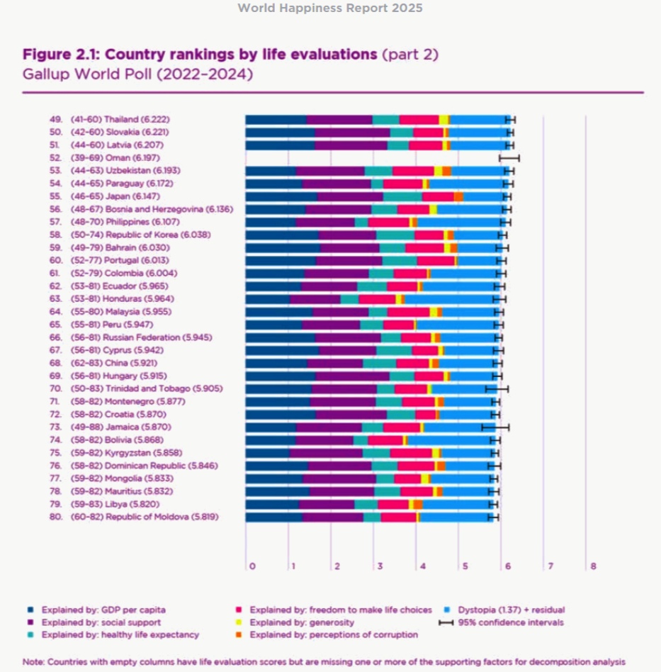 Menurut laporan itu, beberapa faktor utama yang mempengaruhi tahap kebahagiaan termasuk sokongan sosial, pendapatan, kebebasan, kesihatan, dan persepsi terhadap rasuah.