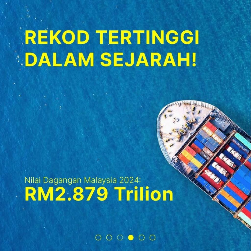 Nilai dagangan negara mencatat RM2.879 trilion, menandakan daya saing eksport Malaysia terus kukuh dalam pasaran global. Ia juga mencerminkan permintaan yang tinggi terhadap barangan buatan Malaysia dan kestabilan rangkaian perdagangan kita.