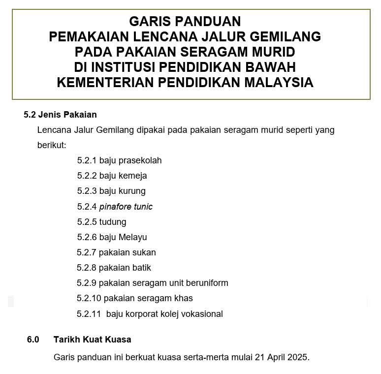 Kementerian Pendidikan Malaysia (KPM) telah mengeluarkan arahan rasmi bahawa semua murid sekolah di bawah seliaan KPM wajib memakai Lencana Jalur Gemilang pada pakaian seragam mereka bermula 21 April 2025. Arahan ini dikeluarkan melalui Surat Pekeliling Ikhtisas Bil. 3 Tahun 2025 sebagai langkah memperkukuh semangat patriotisme dalam kalangan generasi muda.