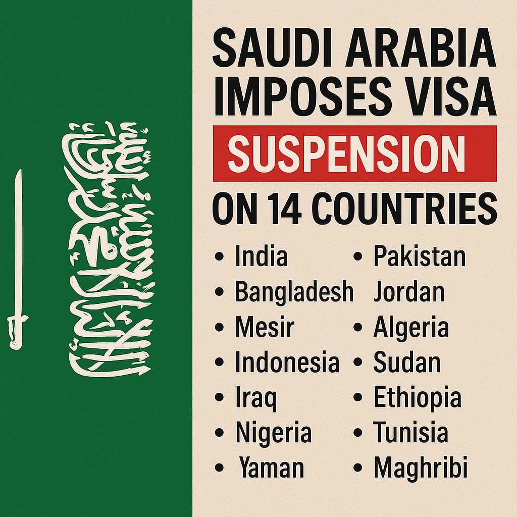 Kerajaan Arab Saudi telah mengumumkan sekatan sementara terhadap pengeluaran visa bagi 14 buah negara sebagai langkah persediaan menghadapi musim Haji 2025. Sekatan ini melibatkan visa jenis Umrah, lawatan perniagaan, dan lawatan keluarga.