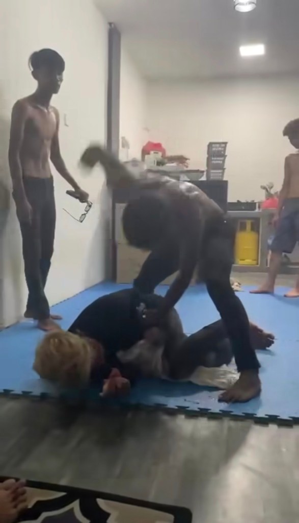 Mangsa kelihatan menahan kesakitan dan cuba meronta, dengan hidungnya kelihatan berdarah akibat serangan tersebut.